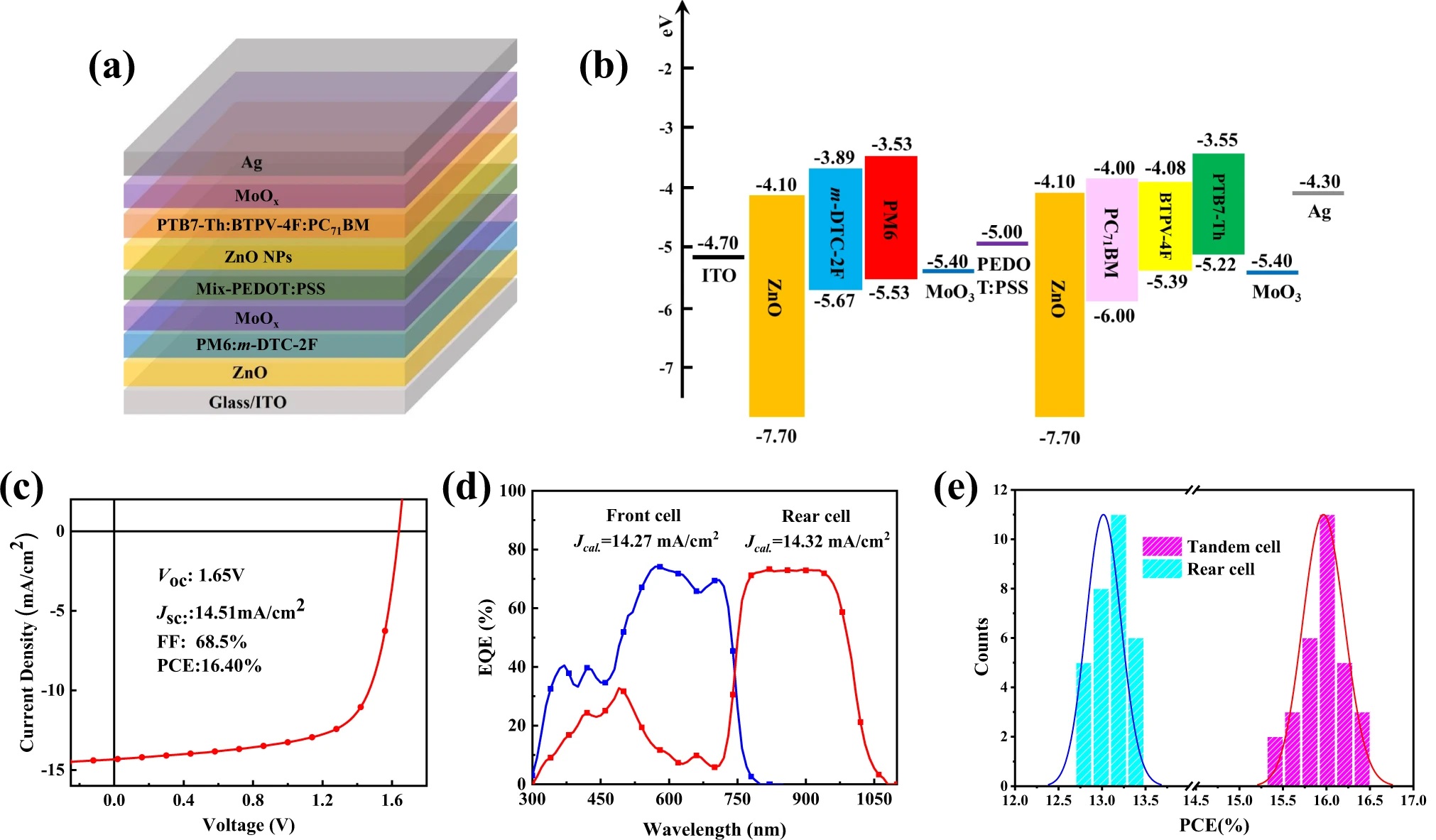 Yongfang extended the pi-conjugation of Y6 by inserting a double bond between the central core and end groups and pushed the optical bandgap to 1.21 eV (BTPV-4F). The single-junction devices based on this novel acceptor achieved a short-circuit current density of 28.9 mA cm−2, and provide ideal conditions for current matching in tandems. The resulting tandem devices reached a high power conversion efficiency beyond 16 % (16.4 % uncertified) and exhibited as well good photostability. Very curious to find out what happens when introducing further double bonds into these molecules – achieving bandgaps comparable to the one of silicon appears to be within reach!