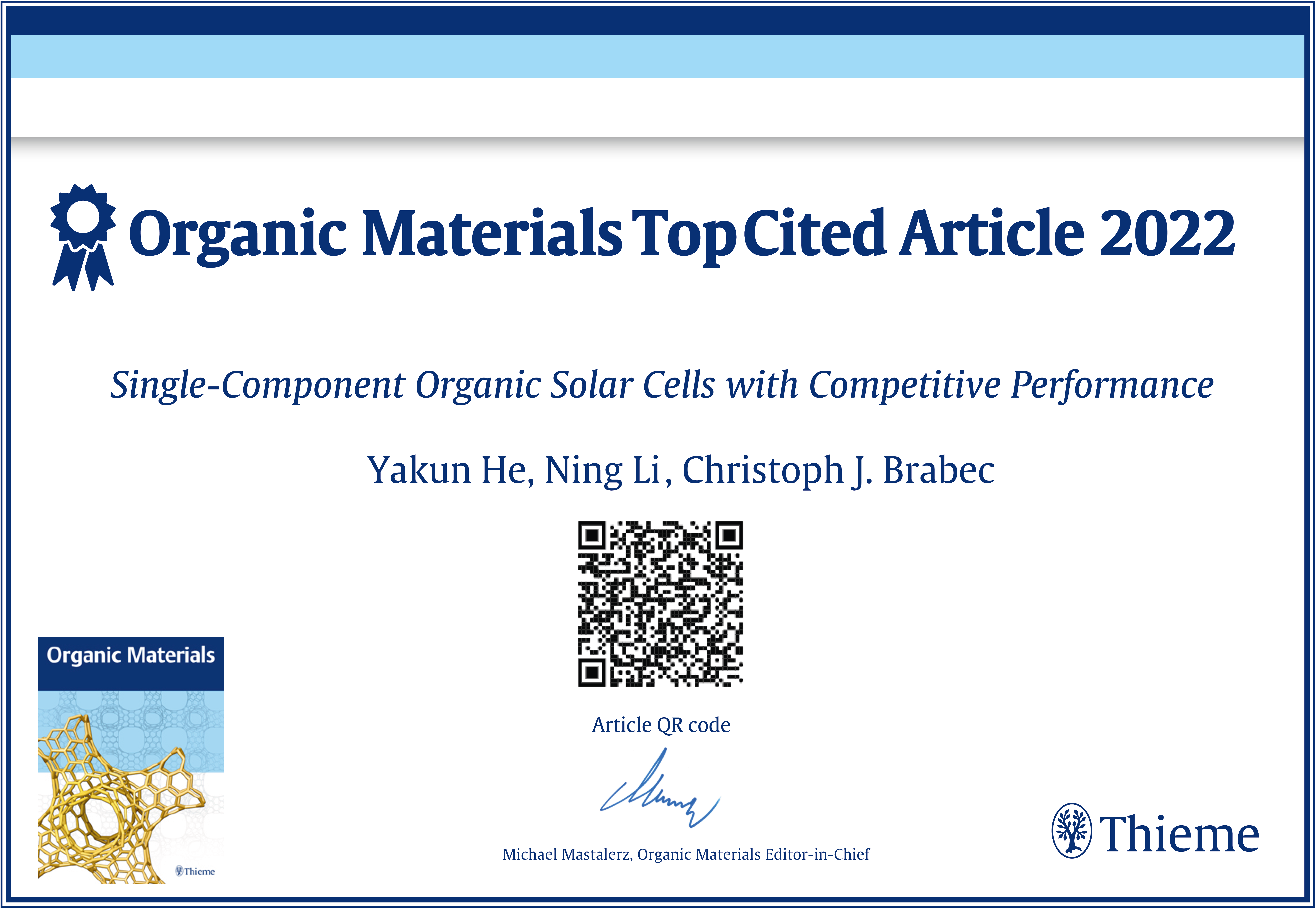 Yakun’s review on single-component organic solar cells dedicated to the 65th birthday of Prof. Peter Bäuerle become a Thieme Chemistry Organic Materials Top Cited Article. Congratulations!