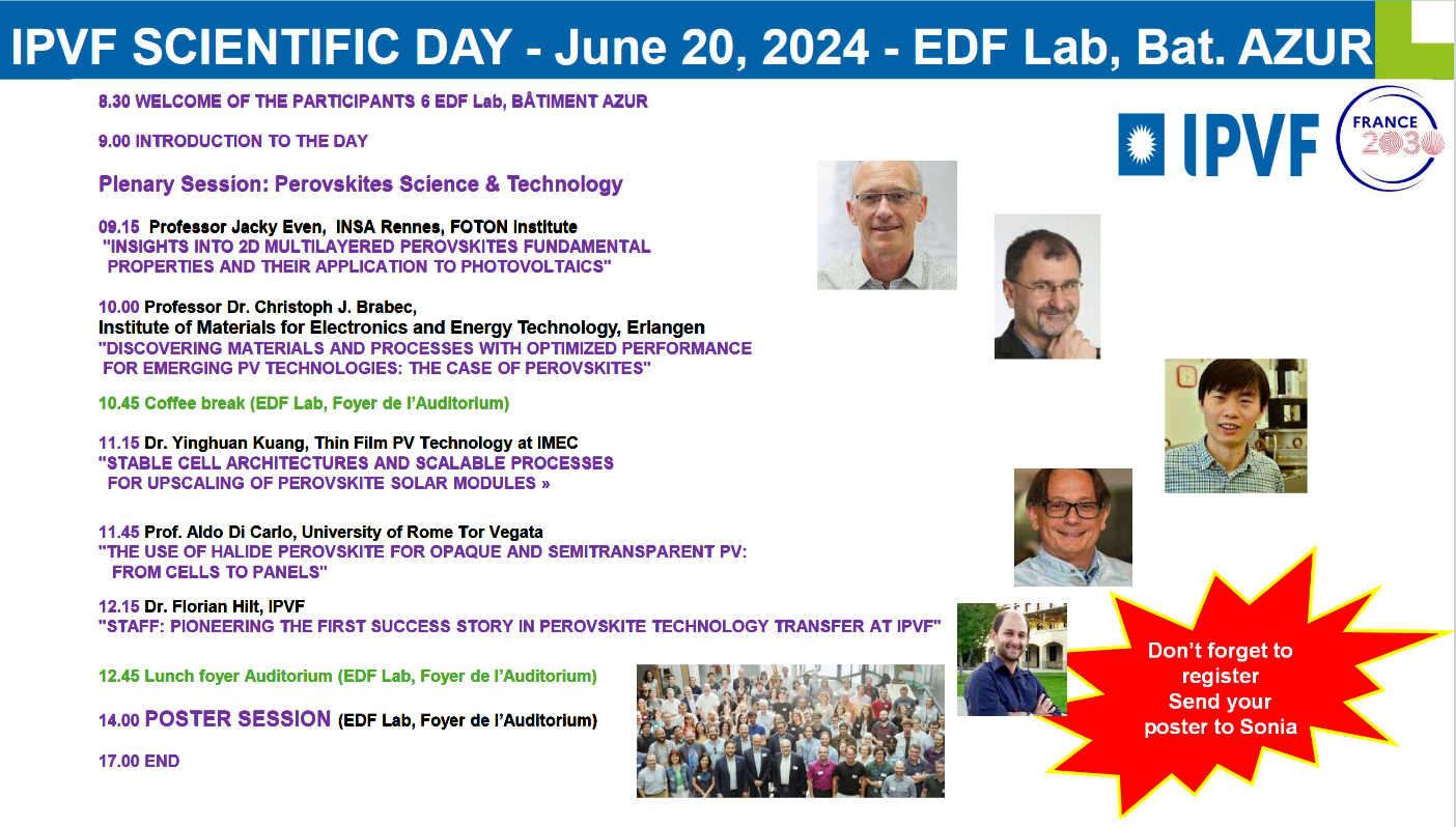 We are pleased to announce the upcoming IPVF Scientific Day, scheduled for June 20, 2024, at the EDF Lab, Bat. AZUR. This event will focus on advancements in perovskite science and technology, featuring a series of presentations by notable experts in the field.