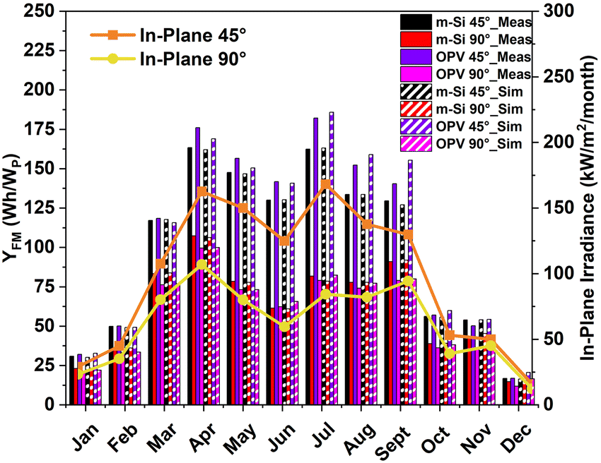 Recently, organic photovoltaics (OPV) have achieved power conversion efficiencies (PCE) above 20% thus coming closer to market entry. Building-integrated photovoltaics (BIPV) and building-attached photovoltaics (BAPV) are two key areas where the functional advantages of both OPV and BIPV/BAPV complement each other and thus could pave the way for market penetration of OPV. Herein, we report on large-area, all-solution-processed flexible OPV modules manufactured by a fully roll-to-roll (R2R) method with high levels of process repeatability. The OPV modules show an accelerated lifetime (ALT) of more than 1000 h and 2800 h under the ISOS-L2 and ISOS-D3 testing conditions, respectively. Long-term outdoor monitoring of the OPV modules was conducted in a typical central European climate, considering two distinct mounting angles that hold significant relevance for BIPV installations i.e., 45° inclination with respect to the ground (representing the optimal tilt angle of the site) and 90° vertical mounting (as mostly encountered in BIPV façades). The ISOS-O2 protocol was used as the test standard for outdoor monitoring. The results show that the OPV modules can offer higher daily specific energy yields (YFD), i.e., higher ratios of daily energy yield and STC WP capacity of the module, than a reference mono-crystalline (m-Si) module for BIPV installations typical of a rooftop case (i.e., 45°), whereas for façade integrated cases (i.e., 90°), OPV modules offer YFD values identical to that of m-Si modules. Detailed laboratory investigations reveal that the higher YFD values of the OPV modules at 45° mounting stems from their negligible temperature coefficient of −0.008% °C−1, whereas at 90° mounting, the angle-dependent response of the modules plays a crucial role. © 2025 The Royal Society of Chemistry.