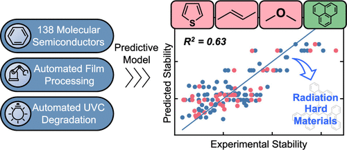 Emerging photovoltaics for outer space applications are one of the many examples where radiation hard molecular semiconductors are essential. However, due to a lack of general design principles, their resilience against extra-terrestrial high-energy radiation can currently not be predicted. In this work, the discovery of radiation hard materials is accelerated by combining the strengths of high-throughput, lab automation and machine learning. This way, a large material library of more than 130 organic hole transport materials is automatically processed, degraded, and measured. The materials are degraded under ultraviolet-C (UVC) light in a nitrogen atmosphere, serving as the conditions for electromagnetic radiation hardness tests. A value closely related to the differential quantum yield for photodegradation is extracted from the evolution of the UV–visible (UV–vis) spectra over time and used as a stability target. Following this procedure, a stability ranking spanning over 3 orders of magnitude was obtained. Combining Gaussian Process Regression based on predictors from structural fingerprints and manual filtering of the materials by features, structure–stability relations for UVC stable materials could be found: Fused aromatic ring clusters are beneficial, whereas thiophene, methoxy and vinylene groups are detrimental. Comparing the UV–vis spectra of the degraded material in film and solution, bond cleavage could be made out as the leading degradation mechanism. Even though UVC light can in principle break most organic bonds, the stable materials are able to distribute and dissipate the energy well enough so that the chemical structures remain stable. The established predictive model quantifies the effect of specific molecular features on UVC stability, allowing chemists to consider UVC stability in their molecular design strategy. In the future, a larger data set will allow to inversely design molecular semiconductors which show high performance and radiation hardness at the same time.